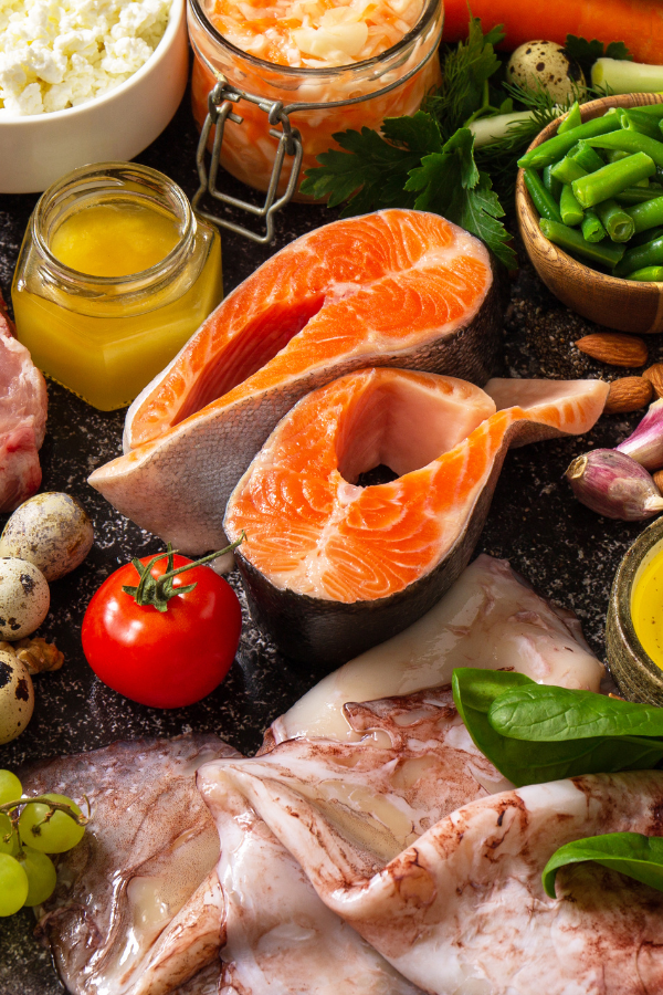 Meat, fish, poultry, (some) fruits, non-starchy veggies, sweet potatoes and squash (in moderation), nuts, seeds, grass-fed butter and coconut.