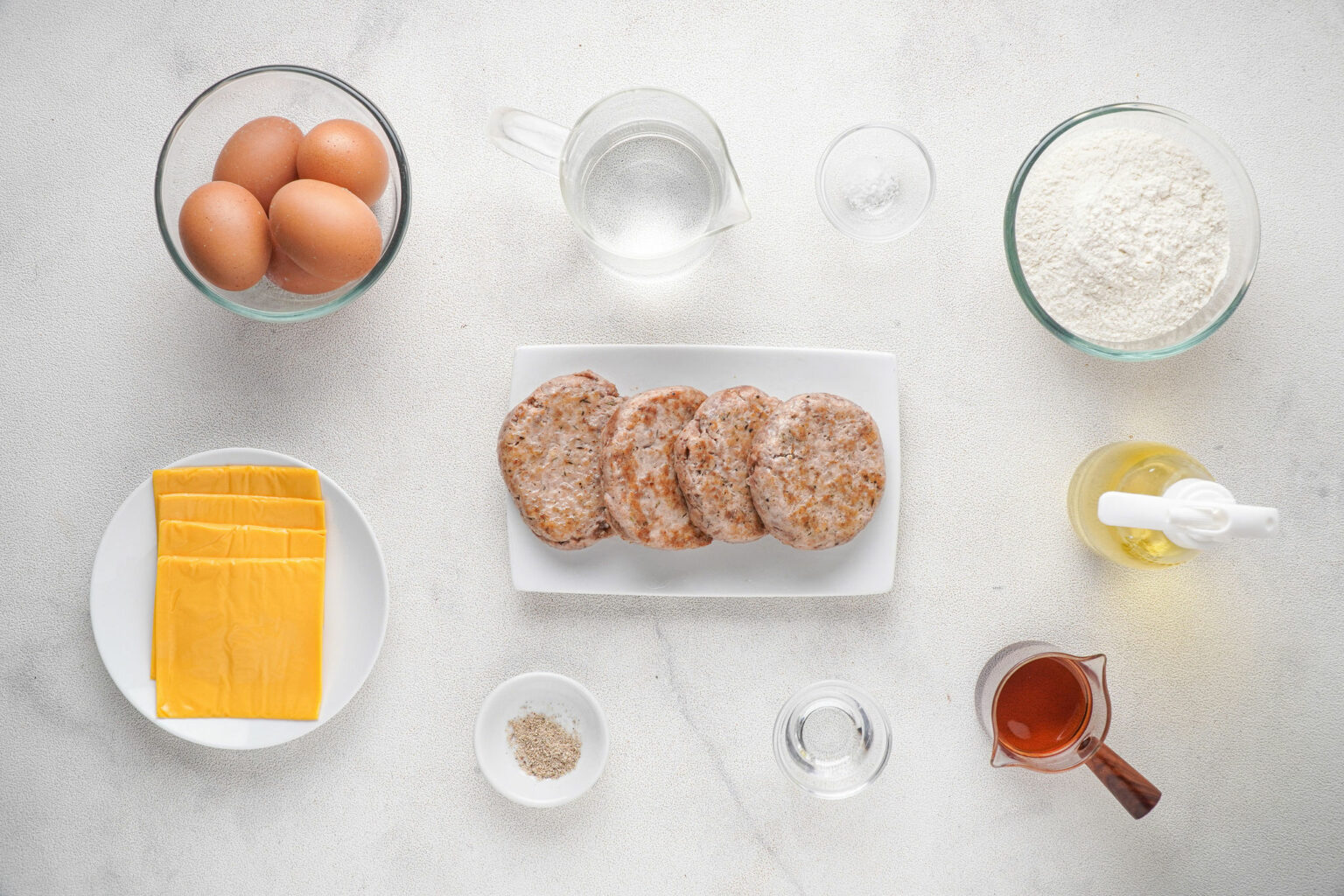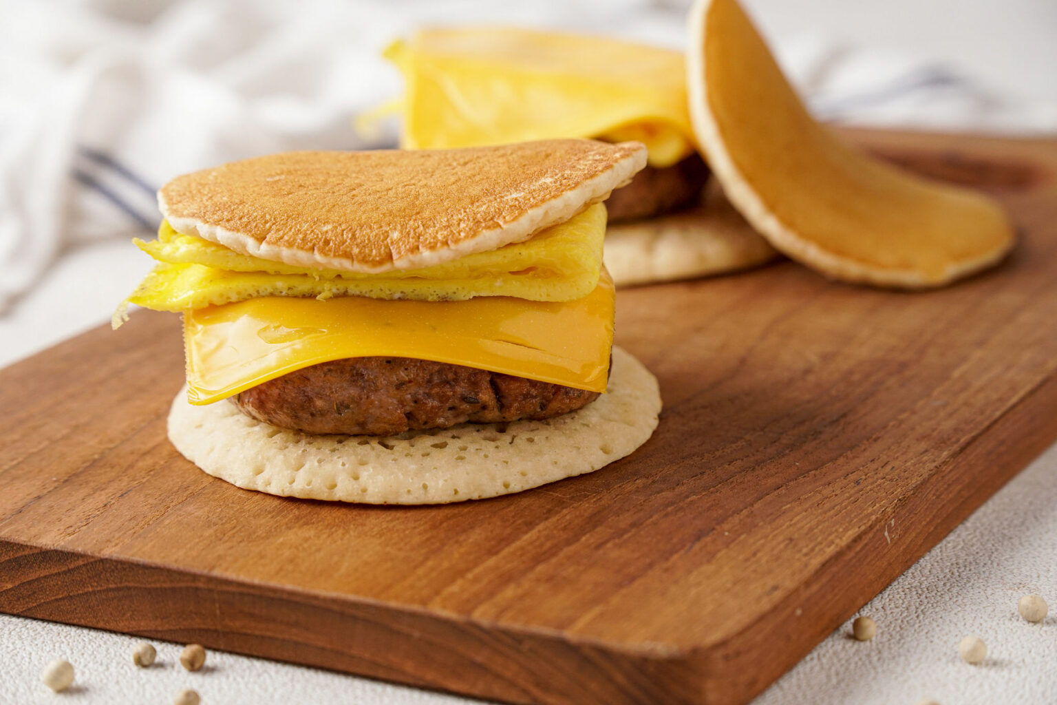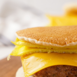 - Assemble the sandwiches: Place a sausage patty on top of a pancake and add the egg with cheese before topping with another pancake. Repeat with remaining four sandwiches.