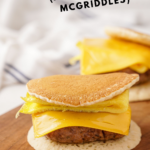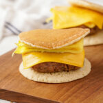 My personal favorite way to enjoy pancakes is to make a breakfast sandwich similar to a McGriddle. Sweet pancakes with maple candy, savory sausage and egg, and simple to assemble, this is the perfect option for a weekend breakfast.