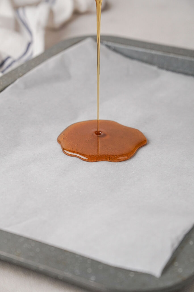 First, you’ll line a baking sheet with parchment paper and set that aside. Next, you’ll heat the maple syrup in a small pan over medium heat.