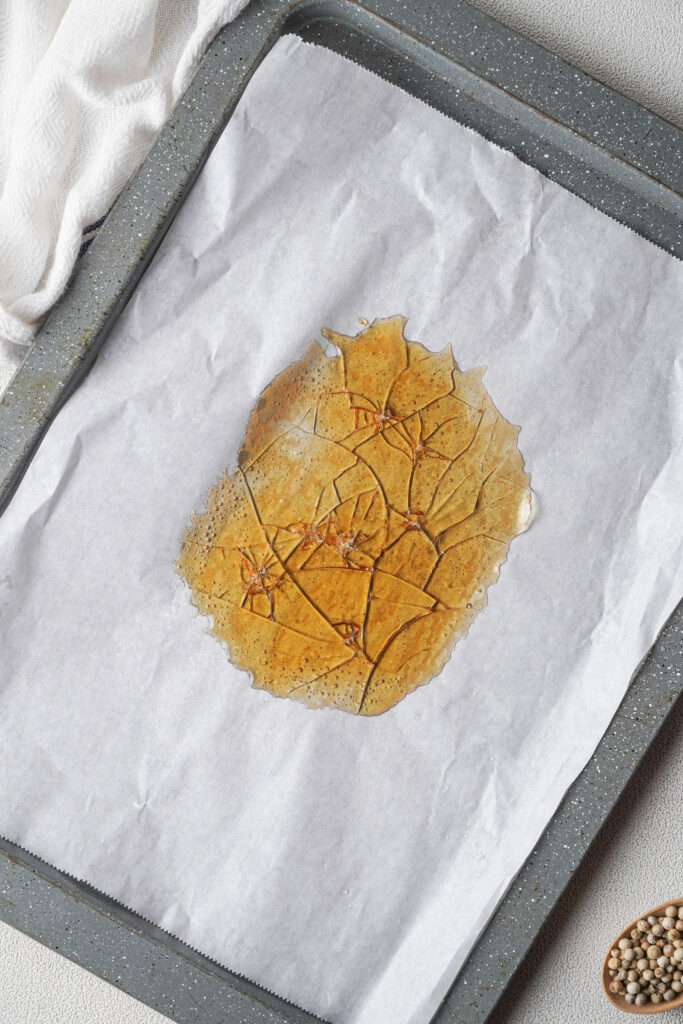 Once it’s reduced, immediately pour the syrup onto the parchment paper, and use a spatula to spread it into a thin layer. Allow this to cool for about 10 minutes before breaking the candy into tiny pieces (you’ll later add this to the pancake batter).