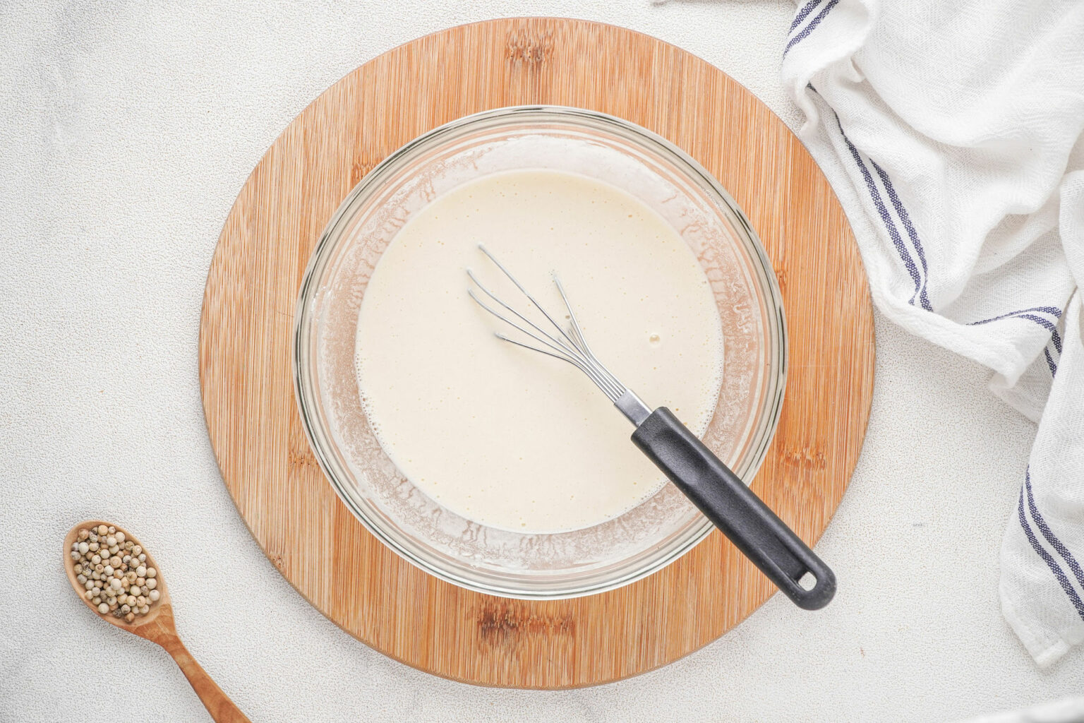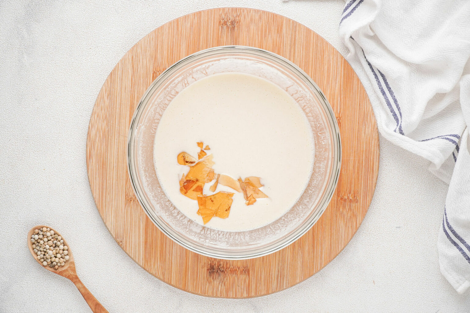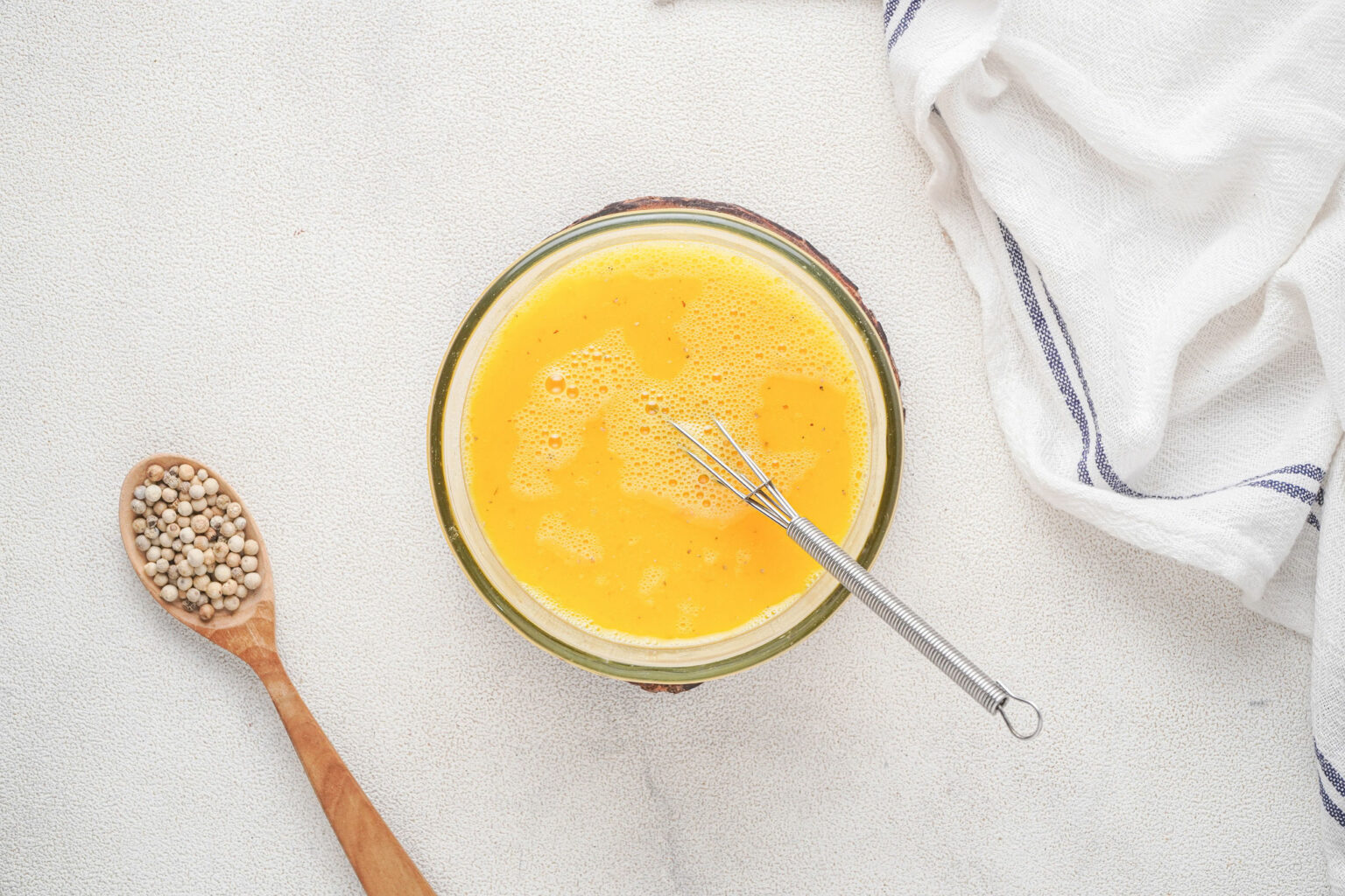 Now it’s time for the eggs! In a small bowl, whisk together the remaining four eggs along with water, salt and pepper.