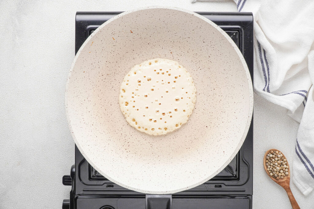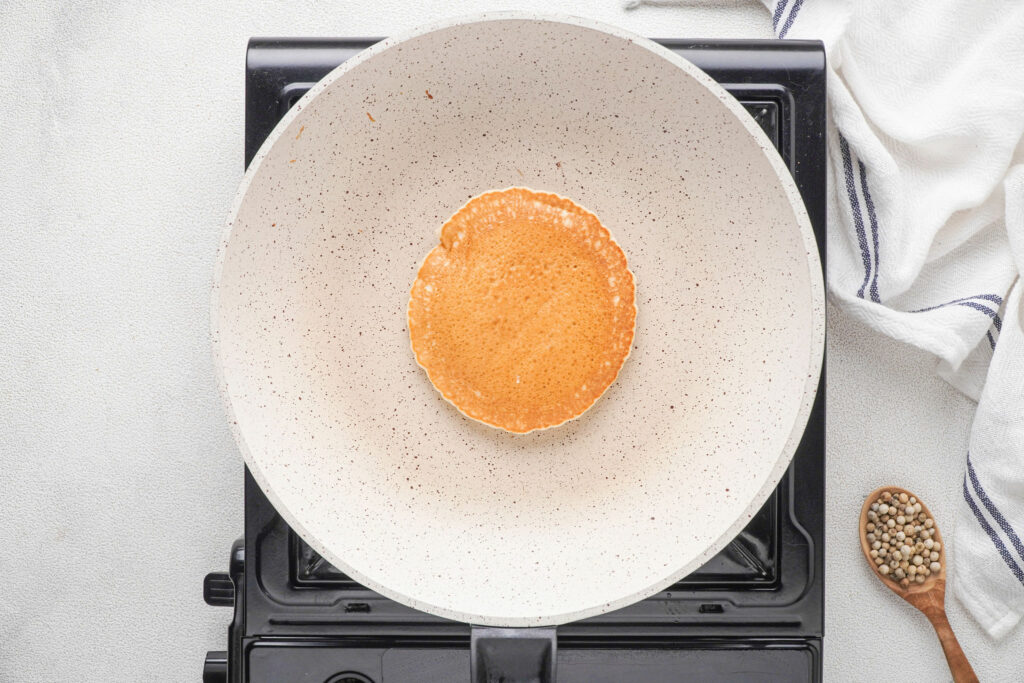 Cook the pancake until golden brown (around 4 minutes) and then flip over to finish the other side (around 2 minutes). Once cooked, place the pancake to the side on a dish and repeat with the remaining batter until you have eight pancakes.