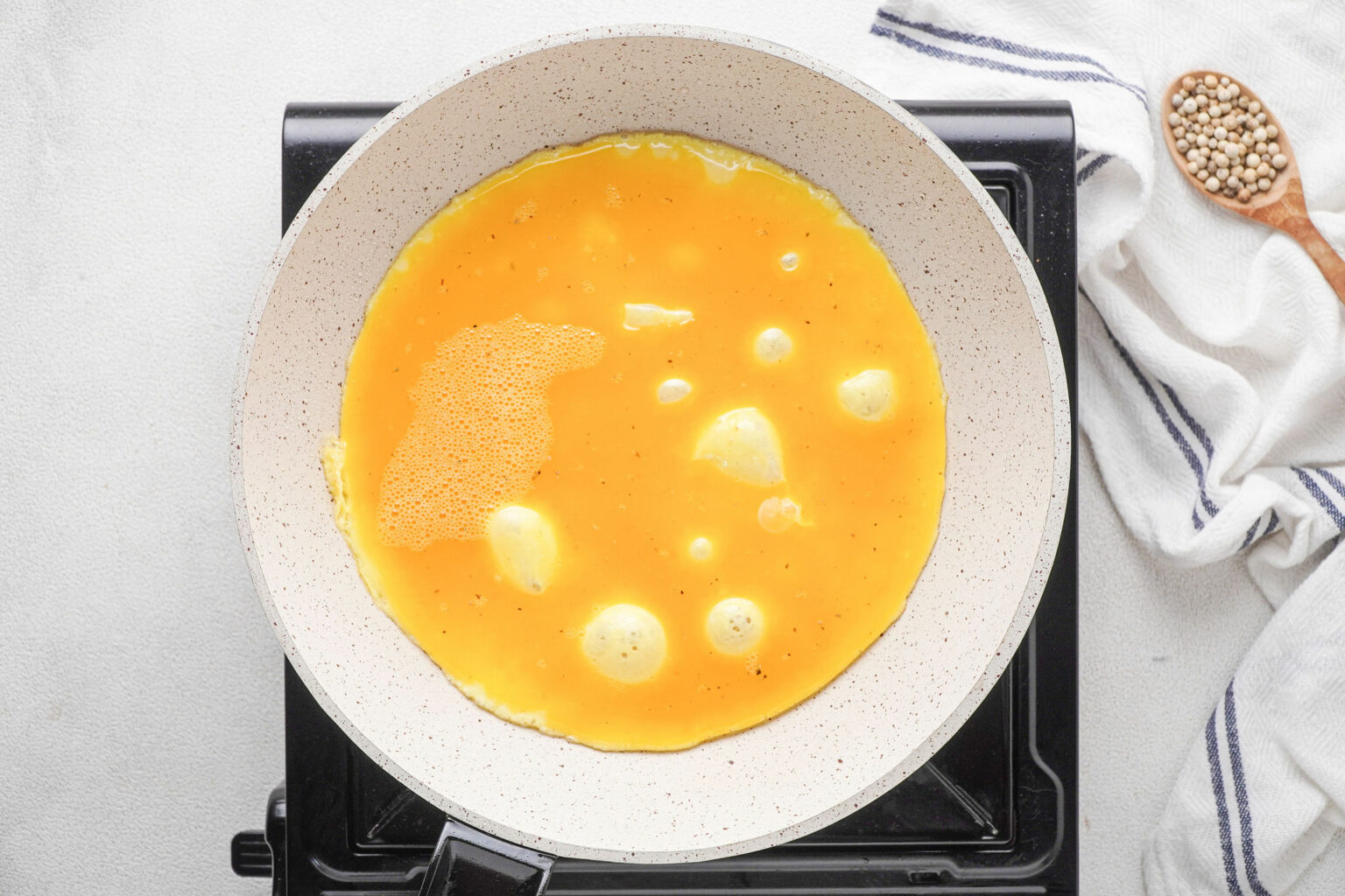 Wipe out the pan or skillet again (I’m all about saving on the number of dishes for cleaning up!) and re-grease. Heat the pan to medium and add the eggs.