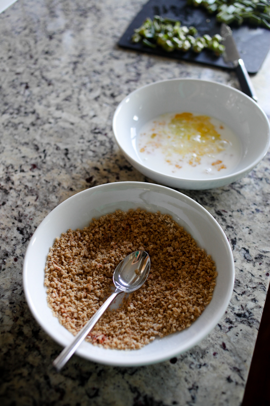 Just like the old recipe, I dipped the okra pieces in egg mixed with a splash of milk, and then rolled them in the panko, which was first seasoned with pinches of smoked paprika, garlic powder, chili powder, and salt.