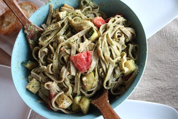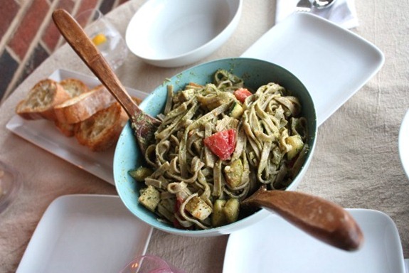 Oh, wow. Fresh pasta is sooo good! And with homemade pesto?!?! Stop it! Stop it right now! 😉 Gotta love a carb-heavy meal.