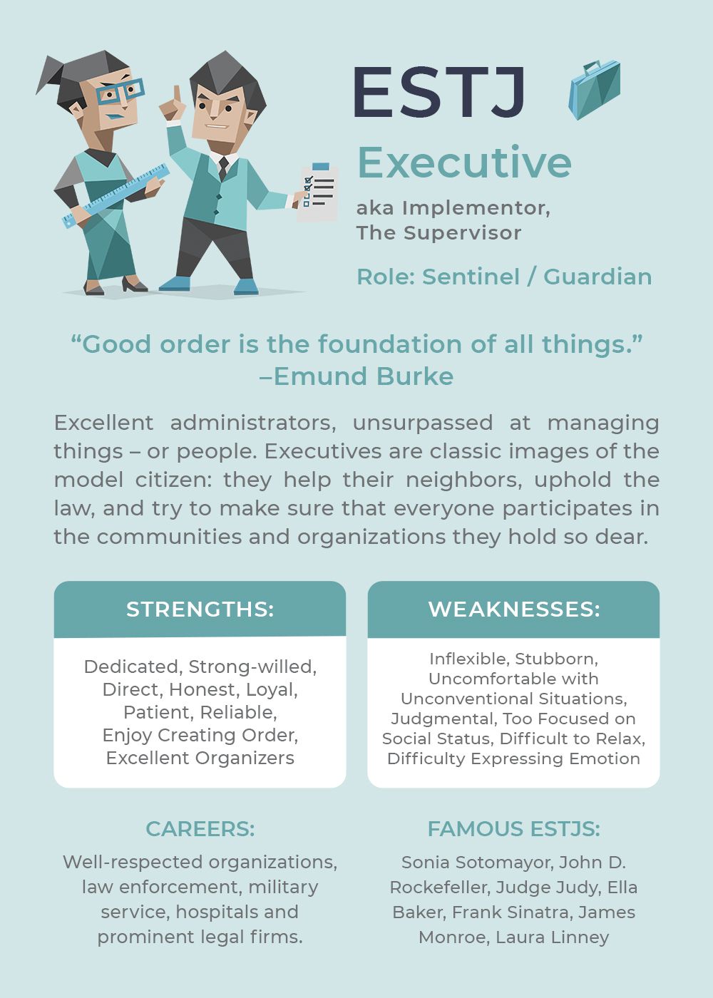 I’ve been an ESTJ (extroversion/sensing/thinking/judging) since high school (and have repeated the test a few times!). I will say that my E/I has gotten “weaker” over time – I used to be a strong E and now it’s a coin toss between E and I. The strengths and weaknesses (!) match me very well. This is one of my favorite personality tests because I think there is enough variation that you can really pinpoint a personality.