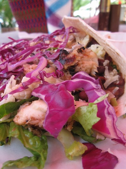 A tortilla, baked, stuffed with red beans + rice, lettuce, grilled white fish, cheese and cabbage. Served with spicy salsa! I ended up eating about half and brought the rest home.