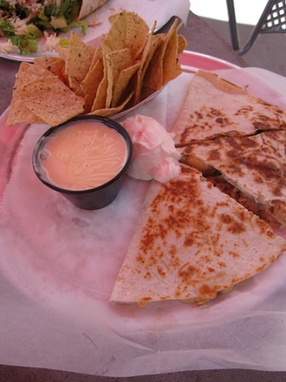 Because they are “that good” we also got a kids’ size veggie quesadilla and some chips with queso. The quesadilla was stuffed with portabello mushrooms and zucchini. It was awesome. I had one of the triangles and a handful of chips –