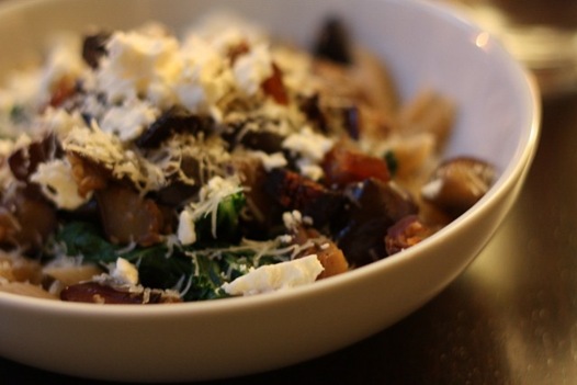 We cooked the eggplant in a skillet in some canola oil, Worcestershire sauce and oregano until it was marshamallowy tender. We also sautéed a bag of kale in some garlic and a little water. We combined those over pasta and decided for a "sauce" we’d each do our own thing.