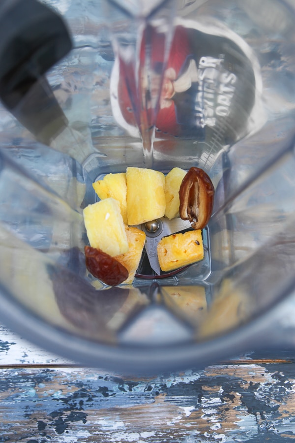 This smoothie is inspired by a pineapple upside down cake. There is frozen pineapple (naturally), a date for a subtle “caramelized” flavor and sweetness, oats for that doughy taste, and vanilla Greek yogurt and milk to blend it all up. And of course – a cherry on top!!