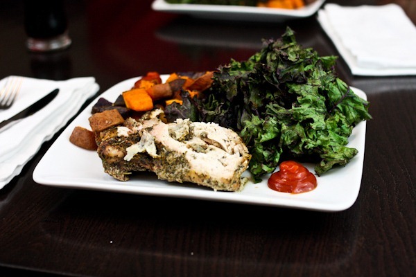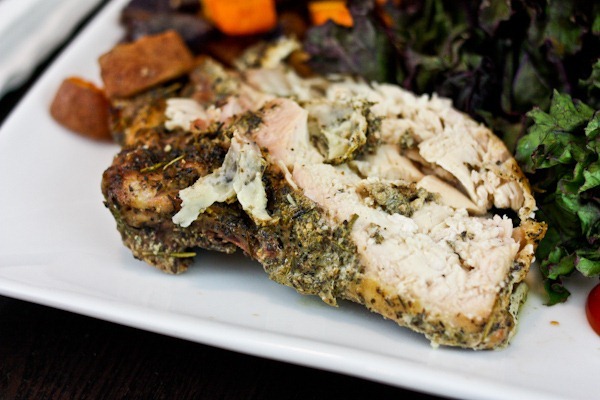 My chicken was attacked because I shaved off half to pack for lunch tomorrow! I will thank myself then. This was The Organic Butcher’s herby chicken breasts. Their chicken is SO tender and juicy compared to most I’ve had in my life. I baked this guy for 30 minutes at 400* to the perfect internal temp.