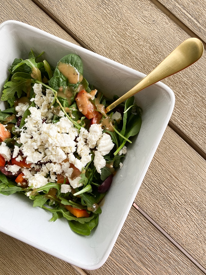 A big salad with feta, olives, pepper, and leftover Mellow dressing. Plus some kids quesadilla!
