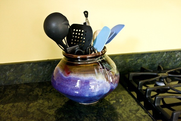 I use a beautiful pitcher and pottery wine coolers to store my utensils on the counter…love the vase you choose for Karen’s kitchen utensils!