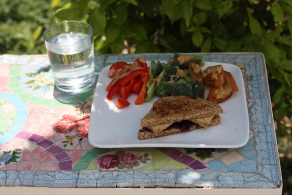 I sliced opened some 3-Grain Tempeh (Lightlife brand) and put it betwixed some GH bread. Matt’s was cheese, jalapenos, mustard and arugula and mine was Crofter’s and grilled.
