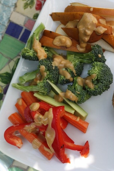 On the side I had fruits + vegetables drizzled in an almond butter sauce!