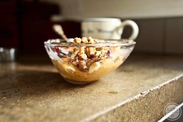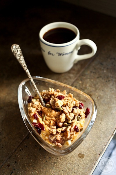Whipped banana oatmeal with 1/3 cup pumpkin stirred in at end (for 1 serving) and 1/3 cup cottage cheese stirred in at end too. Topped with Autumn Spice Granola (which I am LOVING!) and melty Barney Butter. BB is the best because it melts into a glorious puddle!