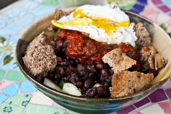 That sounds awesome – like an open-faced huevos rancheros sandwich in a bowl (plus cukes, of course). Mmmmm!