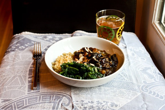 We served the dish with brown rice and sautéed spinach and topped it all with toasted almonds