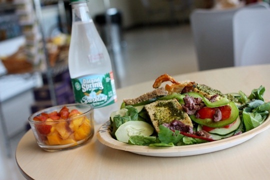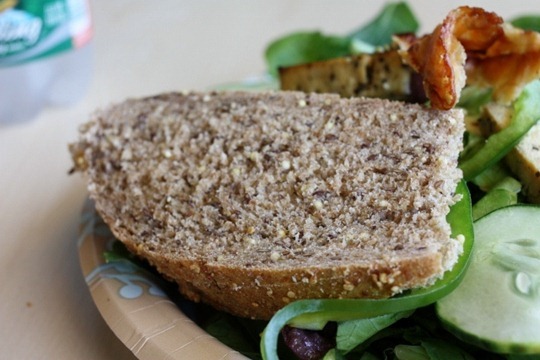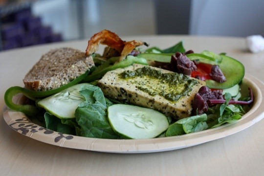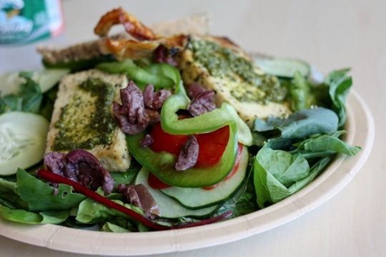 I topped some garden greens leftover from our employee meeting with the makings of our Tofu & Pesto sandwich