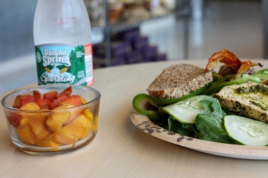 I also brought in a chopped peach from home. I was going to bring him in whole, but I realized he would be majorly squished from my gym clothes, so I chopped him up instead. I much prefer chopped fruit anyways!