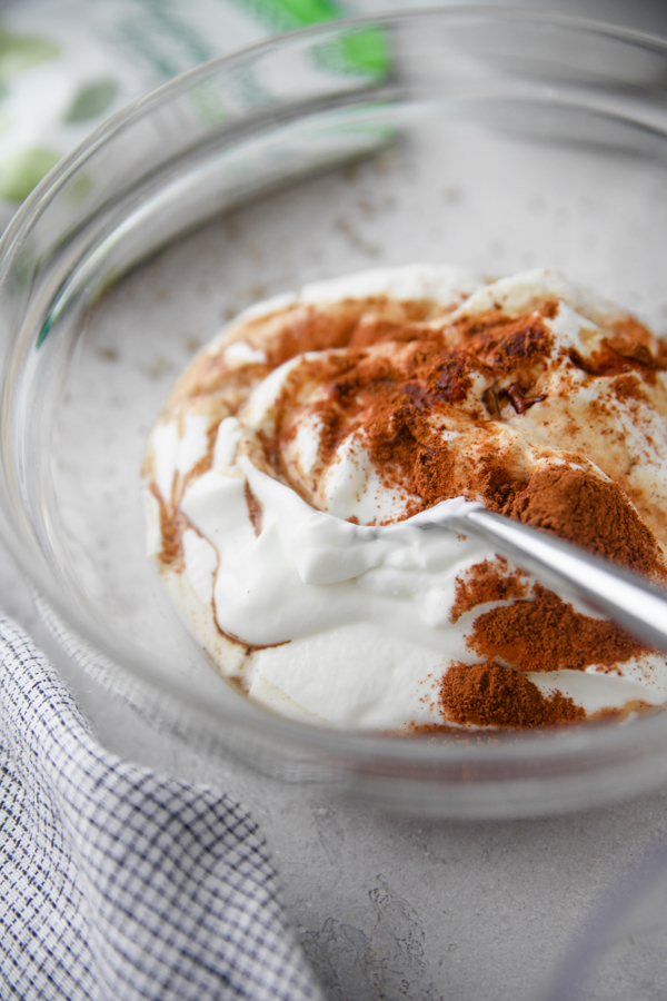 For an extra layer of flavor (and protein!), I mixed a plain full-fat thick Greek yogurt with cinnamon, maple syrup, and vanilla for a healthier take on whipped cream. Of course you could also use real whipped cream or coconut cream too! Or a vanilla or spiced yogurt.