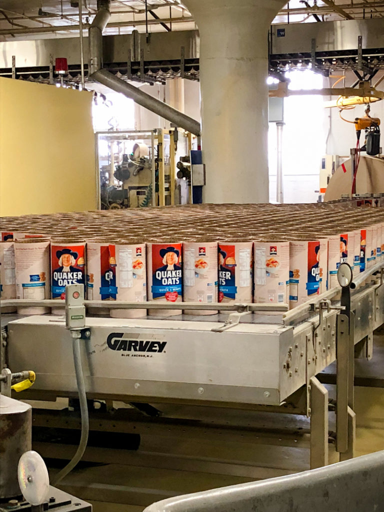 Upon entering the mill, all kinds of delicious smells wafted about. From maple syrup and brown sugar, to the aroma of toasting oats. We talked oats to start, reviewing the milling process and nutritional properties. The oats begin their life growing in fields, mostly in Canada. Quaker has a Direct Growers Program which is comprised of about 400 farmers who are proud to grow oats for Quaker. The Direct Growers program provides about 50% of the oats for Quaker (and that’s a LOT of oats!) We were joined by Al, one of Quaker’s Direct Growers from Saskatchewan, who farms with his brother and their families. He said this year’s harvest was ideal with a few rains early and dry weather up to the harvest.