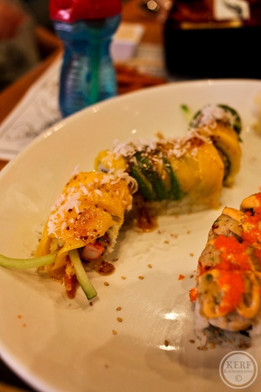 The Neon Dion Roll: Tempura coconut shrimp, kani, English cucumber inside, coated in tempura flakes. Topped with fresh mango, avocado, spicy honey marmalade and coconut flakes. Mango + coconut for the win!