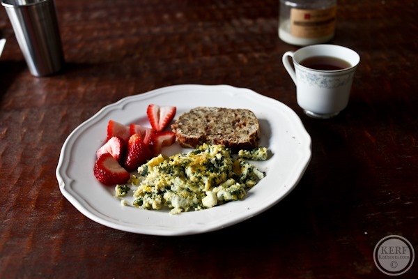 For breakfast the next morning we had a big spread of things, including eggs with spinach, fruit and Great Harvest Gluten X bread I brought. The perfectly steeped English tea was my favorite part!