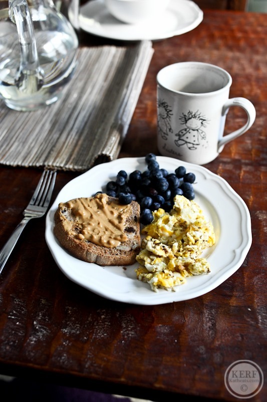 Final breakfast!! And fuel for the big party. Eggs, blueberries, PB toast and more tea.