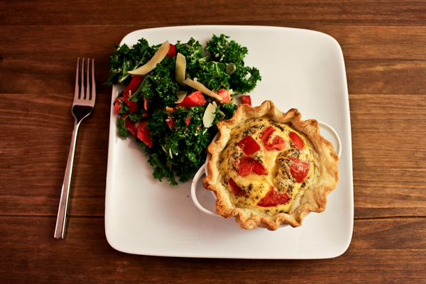We didn’t want to wait for ages for a full-size quiche to cook, so we compromised and made mini quiches for one. Matt whipped up a beautiful crust. Read all about our quiche recipe and technique in this post! I snagged some crust dough trimmings as an appetizer. And I declared that I would like to eat pie crust dough on my birthday this year. Yeah.