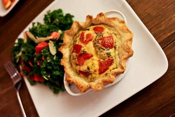 I’d be lying if I withheld the information that we also cracked open a little chardonnay from our Sonoma trip. It paired so well with the quiche! But since it was Sunday, glasses were small : ) We are hoping to make these quiches for company soon because it was so much fun having our own little servings, but first I need to buy a set of cute ramekin dishes! Mine are Crate + Barrel but I doubt they still make them.