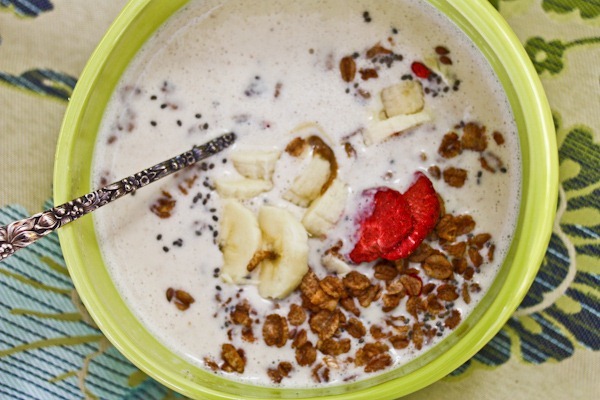 I made a smoothie with greek yogurt (about a cup), banana, oats and coconut water since we had no milk. Worked pretty well! Plus more banana, Uncle Sam Strawberry, chia seeds and Sunbutter on top.