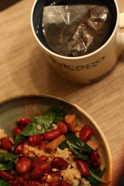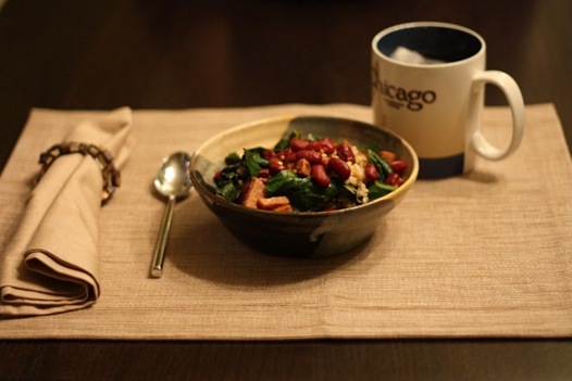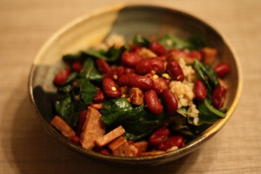 2 Applegate Farms Andouille sausages cooked in a pan with a can of drained kidney beans and a bunch of trimmed + washed collard greens. Served over brown rice with Durant’s BBQ sauce + Big Papi sauce (both were delicious on the dish) and red pepper flakes.