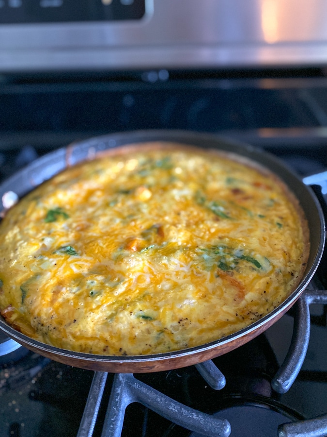 Simple summer frittata. I used a dozen eggs, bell peppers, spinach, and a Mexican mix of shredded cheese. We had this for breakfasts + lunches the next day too. I need to make frittatas more often!