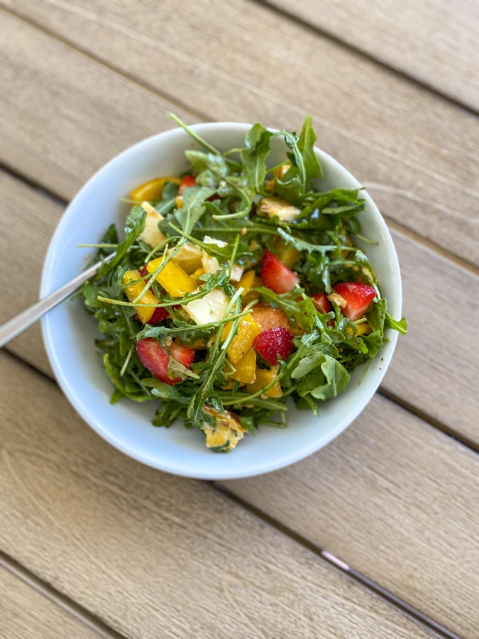 This was one of those “everything but the sink” leftover salads. Inside (I think!) I combined: strawberries, leftover frittata, yellow peppers, goat gouda (our latest obsession) and a homemade dressing.