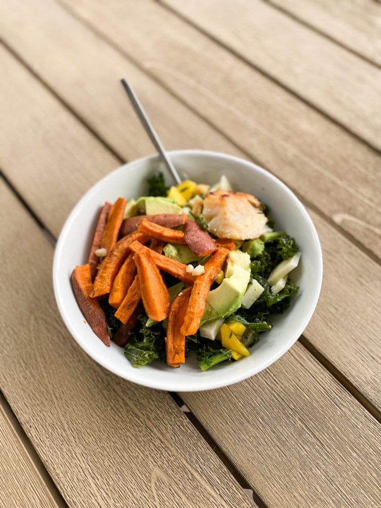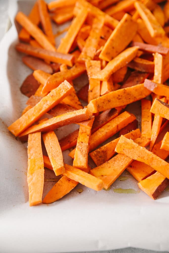 I’ve been roasting up a pan of sweet potatoes every other week (so the kids don’t get sick of them). They’re so good to put on salads too. I cut the sweet potatoes into fries, arrange on a baking sheet with parchment (so it’s easier to clean), toss with olive oil, salt and cinnamon and bake for about 40 minutes at 425 degrees.