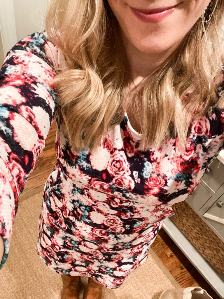 On Saturday night I headed over to Sarah’s for a Galentines party! I told Sarah I was bringing her a dozen roses – on my dress! An old Stitch Fix fav! (You can always get $25 your first order via KERF 🙂 )