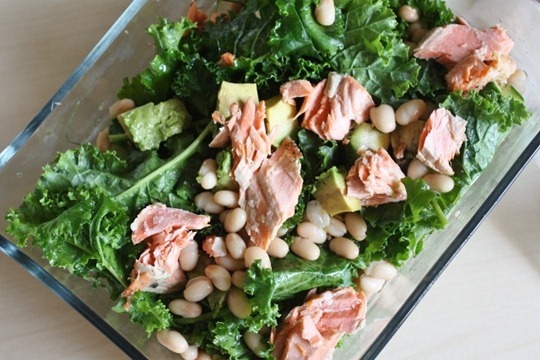 I just sat down for lunch – a delicious blend of leftover salmon + beans + avocado plus garden kale I picked this morning. Eat More Kale! I dressed the salad in the sesame ginger marinade that reader Dani brought me, and it totally made the salad.
