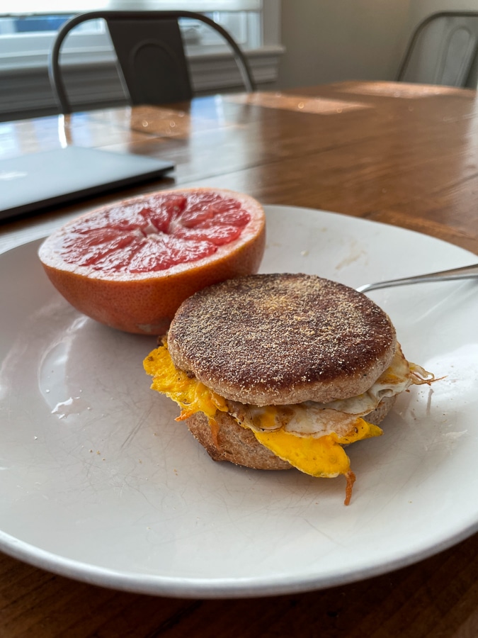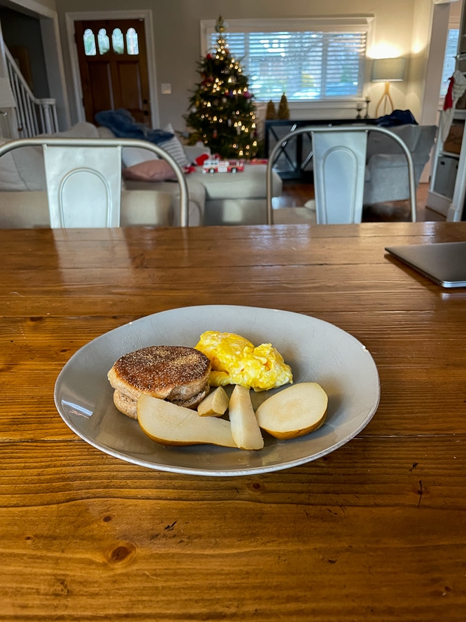 Breakfast after was an English muffin, eggs, and pear. We are all really into pear right now!