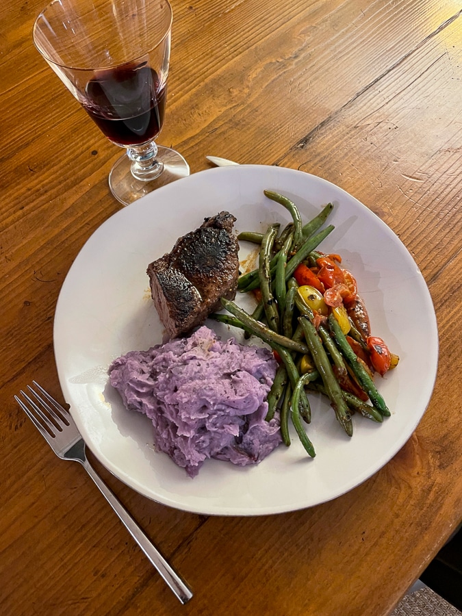 This is where the purple potatoes come in – from Blue Apron! Aren’t these the most beautiful shade of lavender?! With steaks and veggies, this was the perfect date night in. (Although give me a candlelit restaurant any day!)