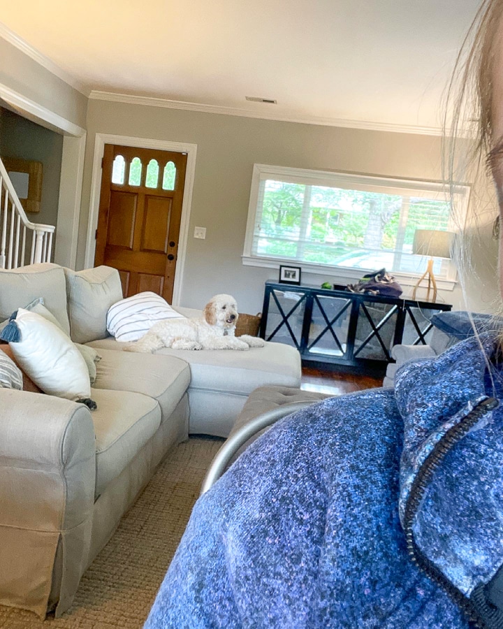 I was in charge of her while the guys went golfing on Saturday. I was a little nervous because it was raining outside and Charlie, who is about 11 months old, has LOADS of energy! She and Gus were romping around, and she was literally bouncing off the furniture 😆