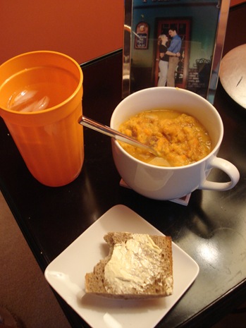 On the side I had a “hunk of crusty bread,” as the cookbooks always recommend with soup. This batch of sourdough was really good. I put a little SB on top.