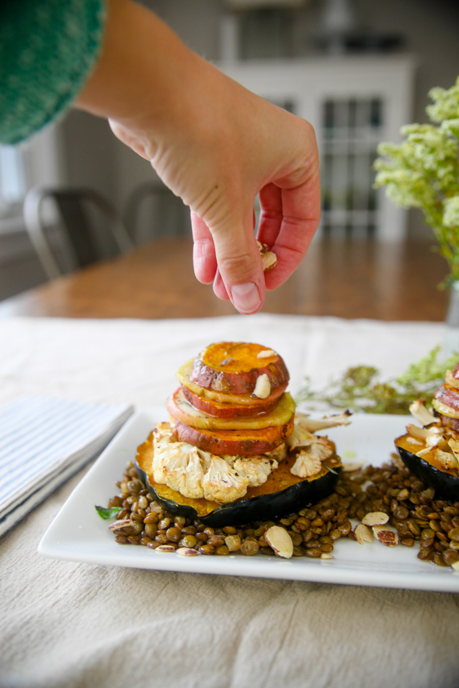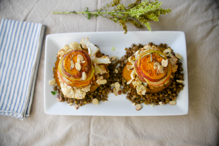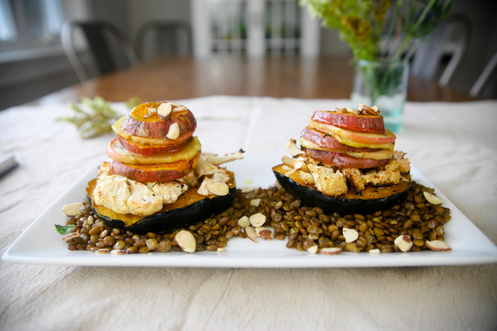 So, sitting pretty atop a bed of lentils are layers of roasted acorn squash, cauliflower “steaks” (see how we have to involve meat to get the cool factor?!), sweet potatoes and apples.