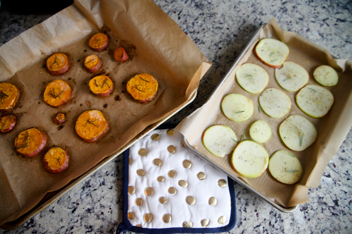 - Lay the slices on the baking sheets. Brush both sides with the rosemary oil mixture, and place baking sheet into the oven. The thicker vegetables should take about 40-45 minutes (or until tender with a fork) to brown up and soften, and the thinner vegetables and apples 10-15 minutes.