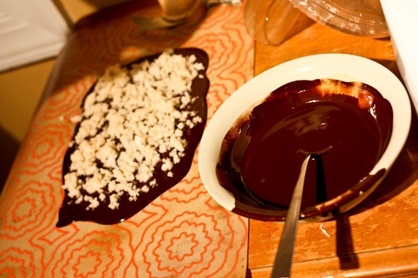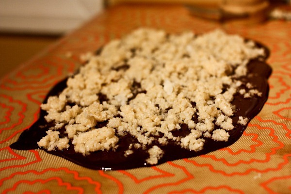 I watched her in action make homemade coconut butter crumbles and sprinkle them over rich melted chocolate to make coconut bark.