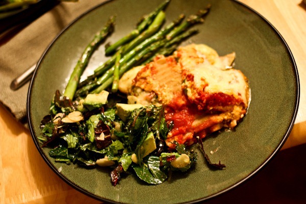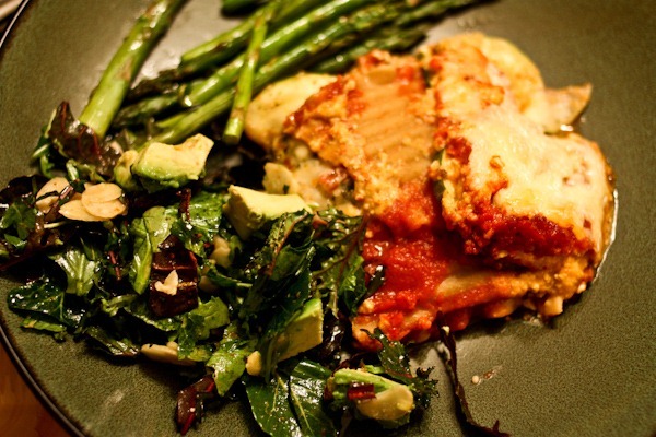 Dinner was ready in time – lasagna made with tofu and cottage cheese that was excellent plus coconutty asparagus and a Faith Salad.