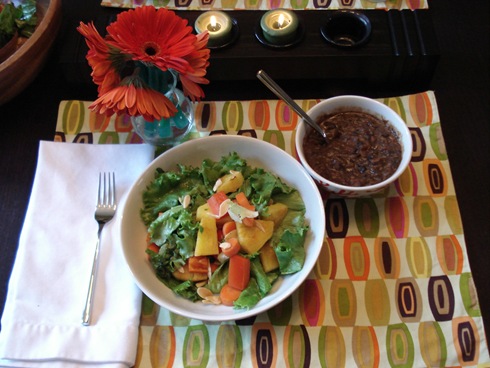 Green leaf lettuce in a homemade lemon-rosemary dressing (just lemon juice, canola oil, chopped rosemary, S+P) topped with sauteed carrot, bed pepper and pineapple – and some toasted almonds. Delicioso!