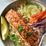 This salmon buddha bowl blends the simplicity of a seared salmon and rice bowl with the rainbow of veggies in a buddha bowl!