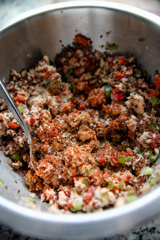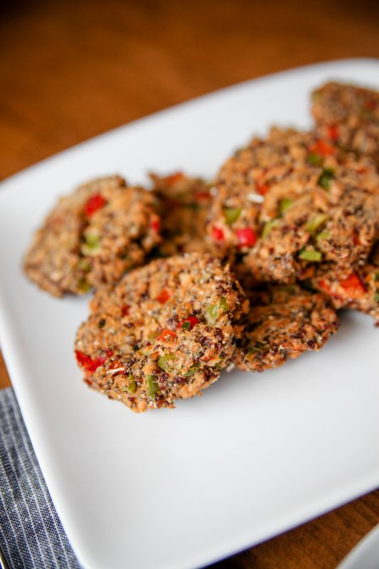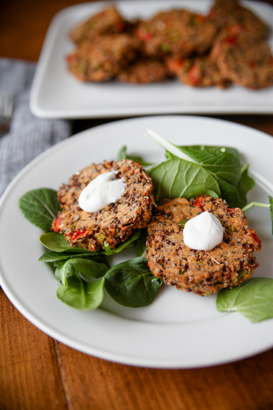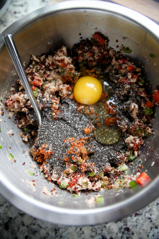 I love burgers, meatballs and patties. They are such fun ways to combine different flavors and textures. These salmon patties do just that with a combo of canned salmon, quinoa, chia seeds, peppers and spices. They are a true protein powerhouse!!